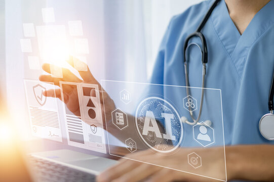 Doctor AI computer, artificial intelligence in modern medical technology and IOT automation. Doctor using AI document management concept.