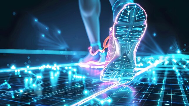 Abstract hologram, shoes and sports for fitness, run and speed for health tracking outdoor, Generative AI illustrations.