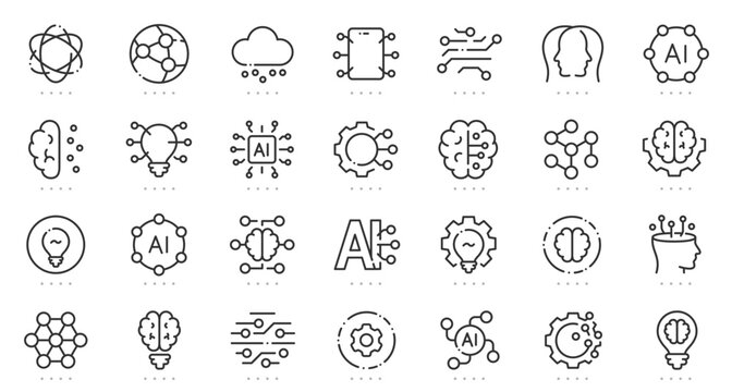 Artificial intelligence icons with brain, neural network, chip, cloud computing, machine learning, innovation, automation, and digital technology symbols