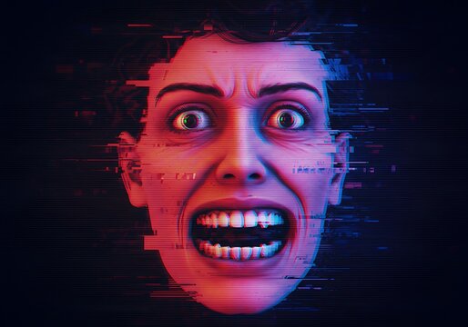 Female android with glowing circuits and wiring suffers from overheating, releasing smoke from her head. The scene captures a moment of technological malfunction and danger