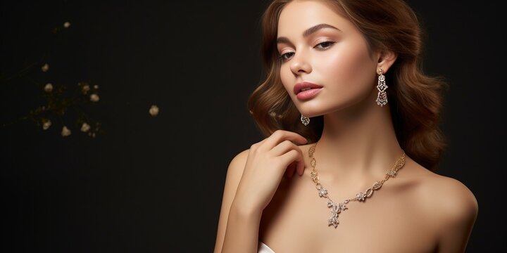 Generative AI : Beautiful girl with set jewelry . Woman in a necklace with a ring,