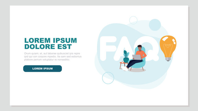 Adobe IllVektor-Illustration der Buchstaben FAQ, daneben eine Glühbirne, im Vordergrund ein Mann, der  auf einer Couch mit seinem Laptop sitzt  - Inspiration und Innovation Konzeptustrator Artwork