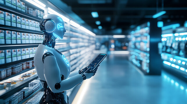 Robotic automation revolutionizing autonomous retail store experience high-tech environment engaging perspective