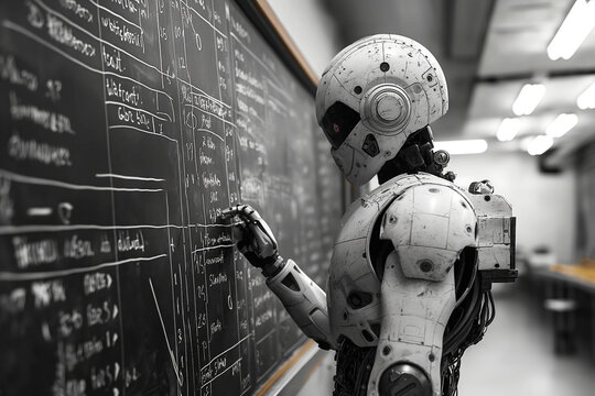 modern white robot teacher professor teaches at blackboard in college classroom