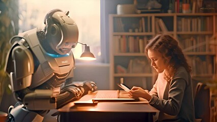 An artificial intelligence robot helps a teenager with homework, they read books together.generative ai.