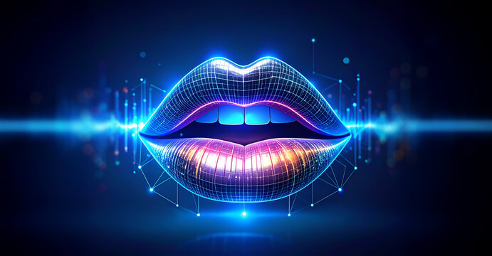Ai voice generator. Lips of a robotic person with dynamic glowing elements lines and dots on a dark background in blue, black and purple tones. AI generated music. Natural language processing. Banner