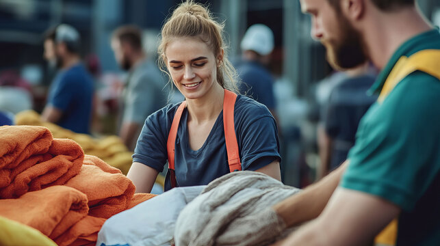Many volunteers pack aid supplies into boxes outdoors. People in bright orange safety vests work together diligently. Fill bags with provisions for victims of possible disaster. Large group works