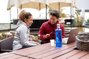 Personal trainer, coach or fitness instructor helping an active and fit woman in the gym. Young female athlete sitting down and managing her workout routine or schedule with her exercising partner
