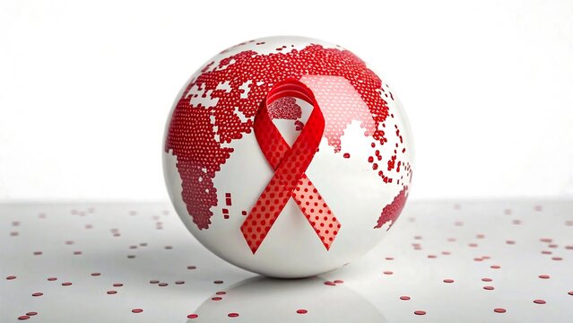 World globe with red ribbon symbol for hiv aids awareness and support