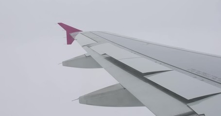 Wing of the aircraft with deflecting flaps during the flight of the aircraft in dense clouds