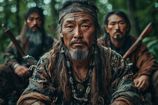 アイヌ民族の衣装を着た男女とヒグマのイラスト