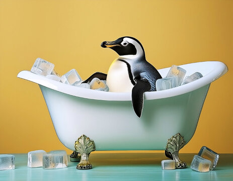 Penguin sitting in claw foot bathtub with ice cubes to cool off, air conditioning concept, copy space