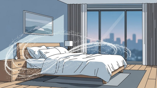 Modern bedroom with bed, nightstand, and city view, air circulation concept