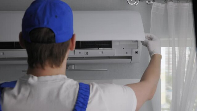 A professional repairman of air conditioning equipment replaces the filter elements. A man in uniform and gloves takes out the grilles from the air conditioner for cleaning and prevention