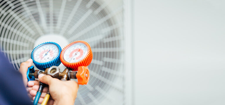 Technician Performing Maintenance on Air Conditioning Unit in Residential Garden During Daytime