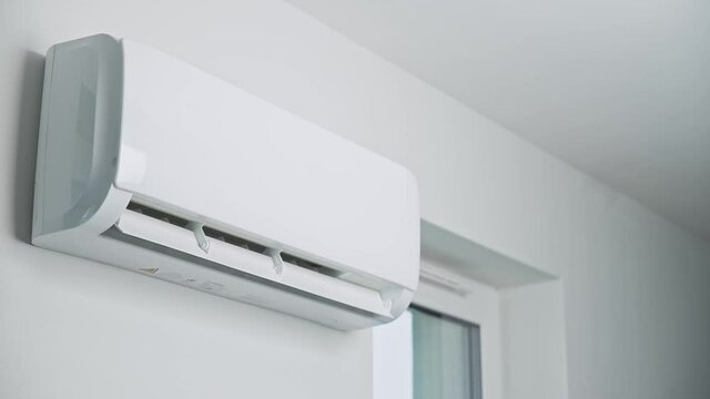 Hand adjusting temperature on air conditioner with remote control, Working air conditioner for comfort temperature in home at hot summer