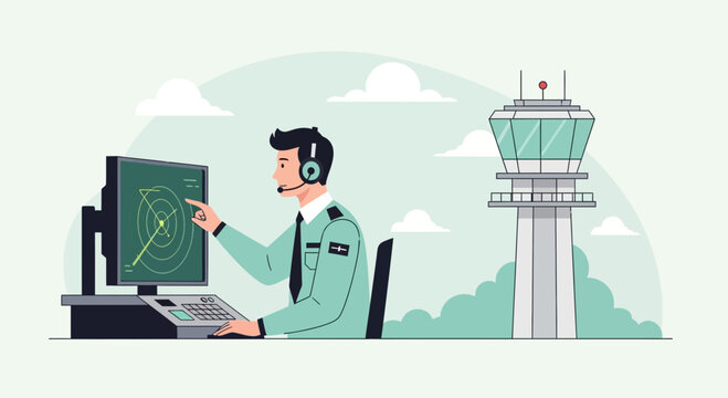 Air traffic controller and supervisor in airport tower controls flight of planes. Airline staff. Man sitting at computer. Employee coordinating airplane direction fly. Vector concept