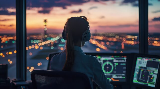 Air traffic controllers, Woman working as air traffic controller in airport control tower.