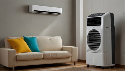 Living room interior featuring air conditioner for comfortable temperature during hot summer, cooling the room