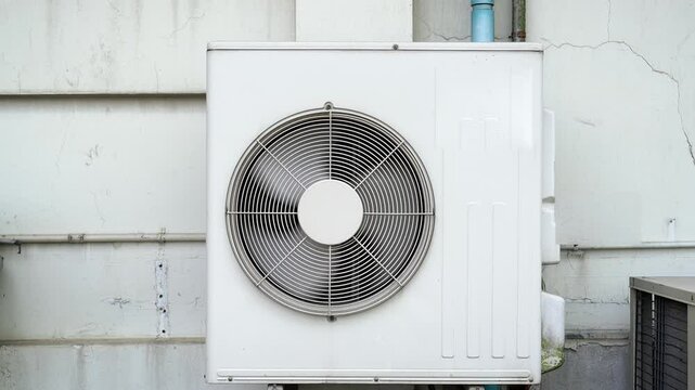 Condensing unit air conditions was running by the fan was moving on the wall of the building, short footage.