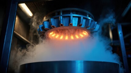 Close-up of the air cooling system in a copper extrusion die, showing fans blowing cool air over the copper rods, quickly lowering the temperature and removing heat