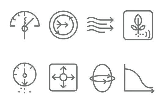Aerodynamic Icons. Line style icons of aerodynamic dispersal tools: filament pitch meter, trajectory adjustment ring, wind flow