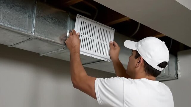 Technician cleaning air ducts with a vacuum hose, inside a modern home, closeup of duct opening with dust and debris being removed, soft daylight illuminating the room, focus on the ventilation system