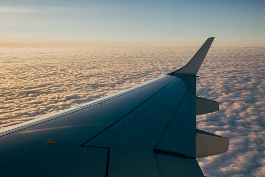 Airplane wing in clouds. Travel concept. Toned image.