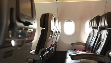 Handheld camera shot inside an airplane showing two rows of empty seats