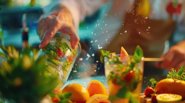 The air is filled with the tantalizing aroma of fruits and herbs as the magician chops and muddles ingredients to create unique and refreshing mocktails.