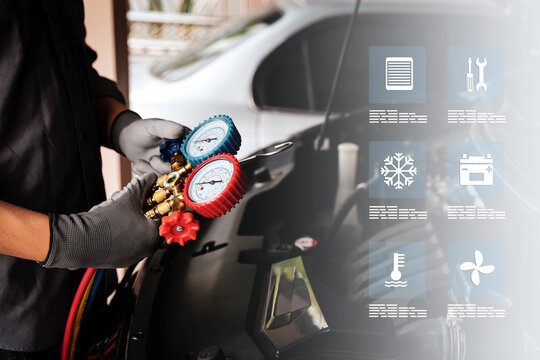 Car mechanic uses air refrigerant meter manifold gauge to check car air conditioner system heat problem and fix repairing and filling air refrigerant.