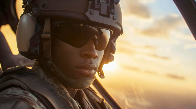 Military soldier and African American pilot flying aircraft in army aviation, chopper and airplane for transportation, air force mission in combat and defense, fighter jet, propeller technology