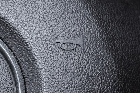 Modern car air horn icon or symbol on a steering wheel. Close up macro shot, no people