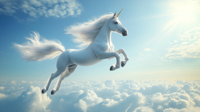 Majestic white unicorn soaring through fluffy clouds in a beautiful sky air hope horn mane tail myth