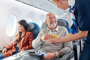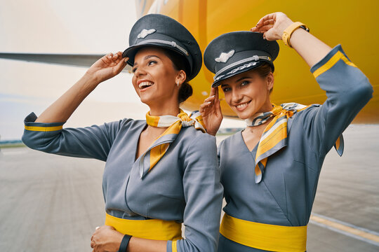 Cabin crew or air hostess working in airplane . Airline transportation and tourism concept.