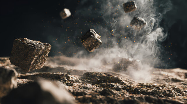Stone fragments suspended in mid air above a rugged surface, a mystical moment captured, ethereal dust and smoke swirling around the levitating elements, creating an atmospheric and intriguing scene.