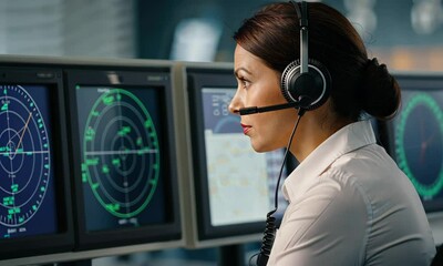 Female air traffic controller monitoring radar screens with headset in control room