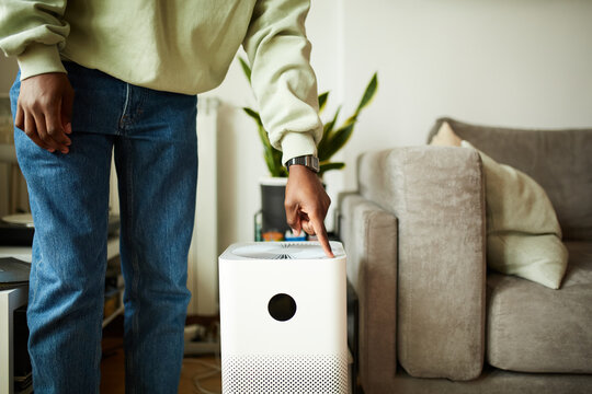 woman's hand presses the touch screen button to start an air purifier in her apartment. Human Health and Technology.