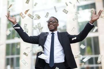 Joyful person throwing money in the air in celebration of success, wearing a suit and glasses