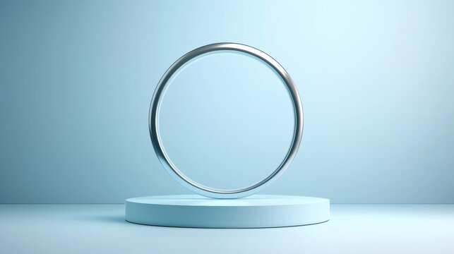A silver ring is suspended in mid-air, hovering above a light blue pedestal.