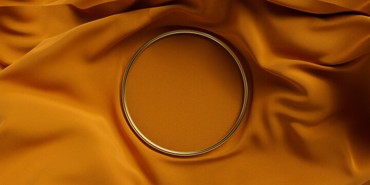 orange background with a golden ring. Beautiful soft wavy folds. Tabletop view. Flat lay. Shiny fabric backdrop with copy space for design, montage