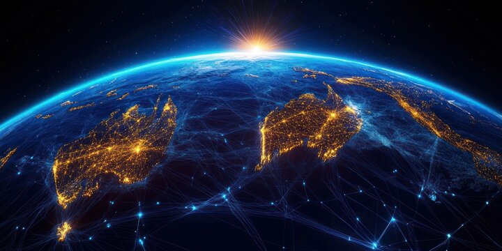 Futuristic Earth Illustration of Australia and New Zealand with Luminous Air Route Network