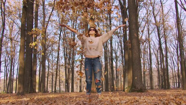Smiling woman outdoors welcoming september autumn season