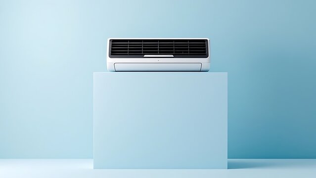 Air heat pump on blue background. Modern, environmentally friendly heating. Air source heat pumps are efficient and renewable source of energy. Banner with copy space for text, advertising.