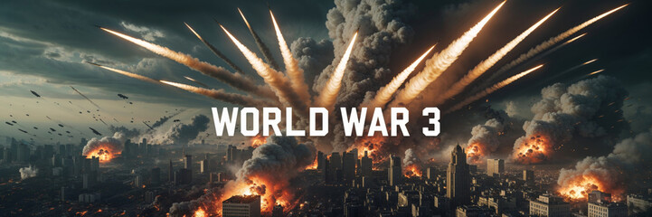 World War 3 visualized, a city under intense bombardment with missiles and explosions.