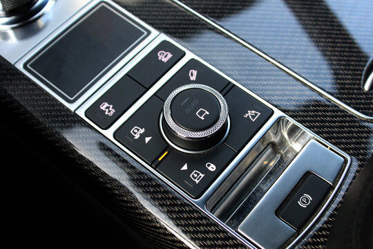 SUV air suspension control. Control panel for off-road functions. SUV driving mode switch, Modern car air suspension adjustment. Air suspension button.