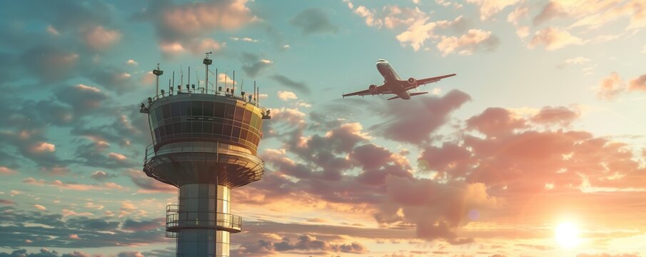 Air Traffic Controller Overseeing Airplane Takeoff in Control Tower at Airport for Flight Safety and Transportation Management