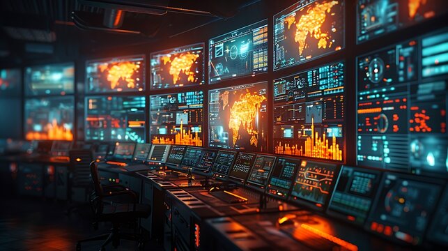 Workplace of the air traffic controllers in the control tower. Team of professional aircraft control officers works using radar, computer navigation and digital maps. Aviation concept.
