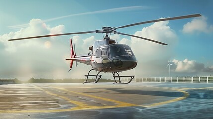 A helicopter hovers above a helipad on a clear day, preparing to land or take off.