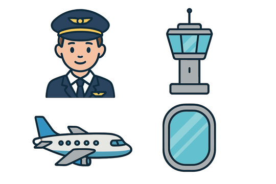 Pilot, plane, control tower and porthole icon set. Aviation cartoon vector illustration. Air travel and transportation concept. Flight, crew and airport graphic elements.